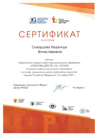 Сертификат всероссийского форума работников дошкольного образования "Ориентиры детства.3.0.онлайн" 2021г