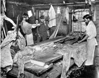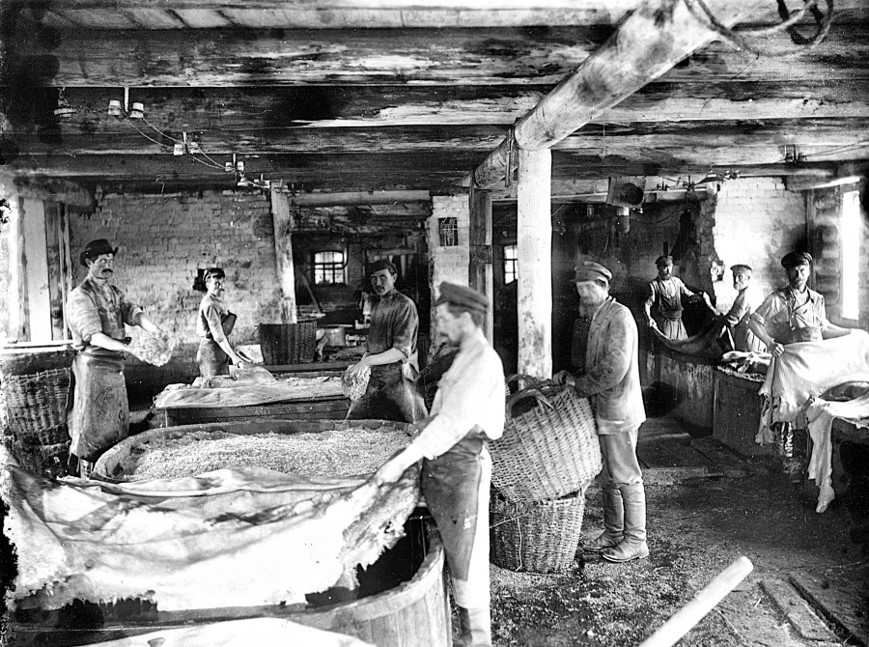 Дубят кожу с помощью раствора дубовой коры. Работа была очень трудной: кожа рук мастеров-кожевенников от растворов чернела и долго не отмывалась, а в кожевнях стоял неприятный запах, духота.